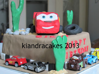 mcqueen cars cake kali ini agak susah di pengerjaan carsnya. karena mintanya carsnya agak gede, bingung karena budget segitu kalo dalenya cake gak masuk. akhirnya dengan sedikit prakarya, styrofoam bekas aku carving membentuk badan si mcqueen baru kemudian dicover fondant. lumayan mirip kan.